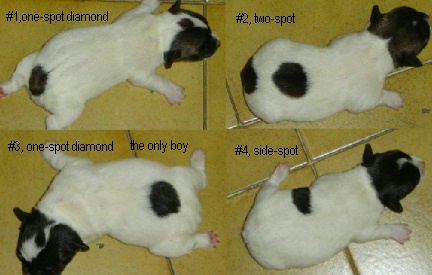 These are the individual photos of the pups after docking their tails on Saturday evening. Most of them have diamonds on their heads, and they have either one black spot on the side or next to the tail, and there is one with 2 black spots on the back.